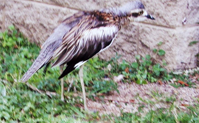 There was the Queen standing out front , Curlews nearby . Three were near the driveway gate , one of them, fluffed up in attack mode , like a pointer dog, staring at the snake, its head visible in the following photo.